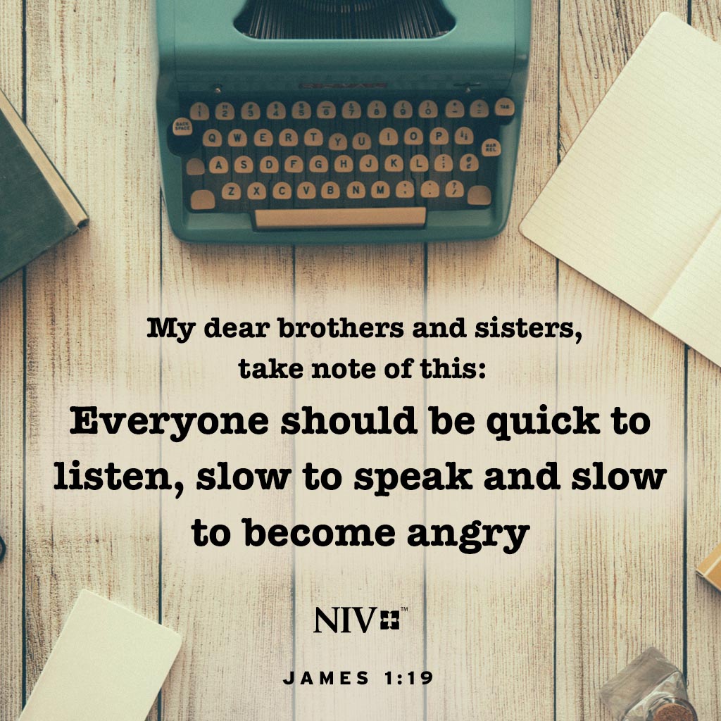 James 1:19 My dear brothers and sisters, take note of this: Everyone should be quick to listen, slow to speak and slow to become angry,