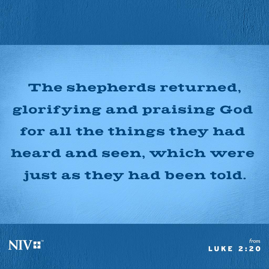 So they hurried off and found Mary and Joseph, and the baby, who was lying in the manger. When they had seen him, they spread the word concerning what had been told them about this child, and all who heard it were amazed at what the shepherds said to them. But Mary treasured up all these things and pondered them in her heart. The shepherds returned, glorifying and praising God for all the things they had heard and seen, which were just as they had been told.